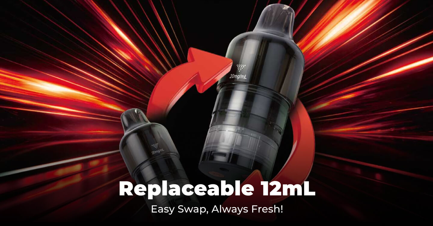– 12mL Replaceable: Smooth throat hit, intense flavor.