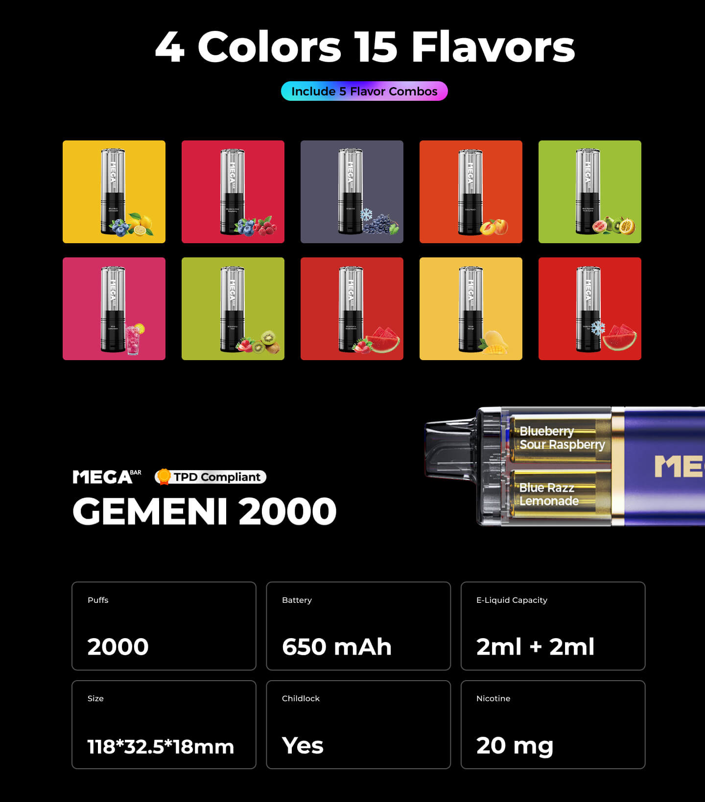 GEMENI 2000 is a 2-in-1 e-cigarette that can last up to 2,000 puffs. You can switch flavors with just one hand by flicking the vape drip tip. The design is compact with visible e-liquid volume, and you can carry it anywhere in your pocket.