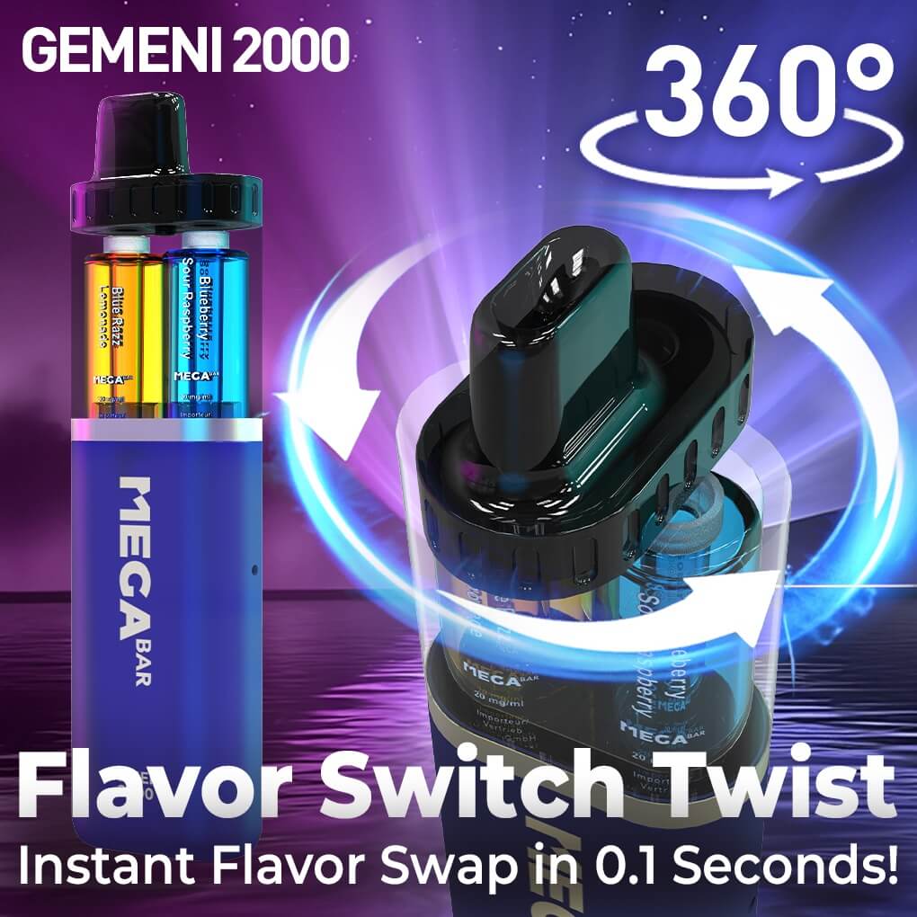 GEMENI 2000 is a 2-in-1 e-cigarette that can last up to 2,000 puffs. You can switch flavors with just one hand by flicking the vape drip tip. The design is compact with visible e-liquid volume, and you can carry it anywhere in your pocket.