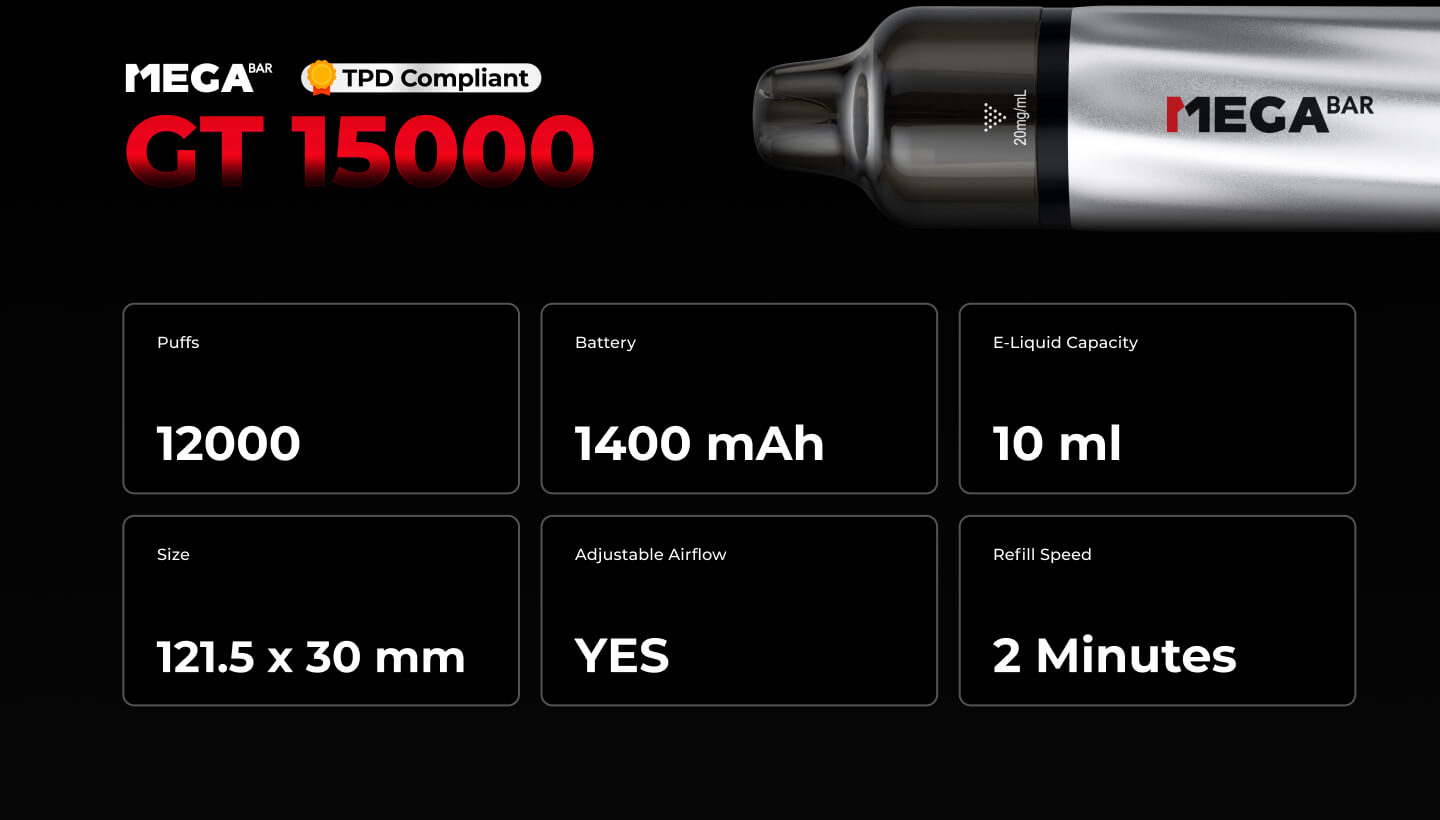 GT15000 is a big puff vape with replaceable 2+10ml cartridges, that can last 7 days with one full charge. A full selection of flavors with best taste are offered for your choice.
