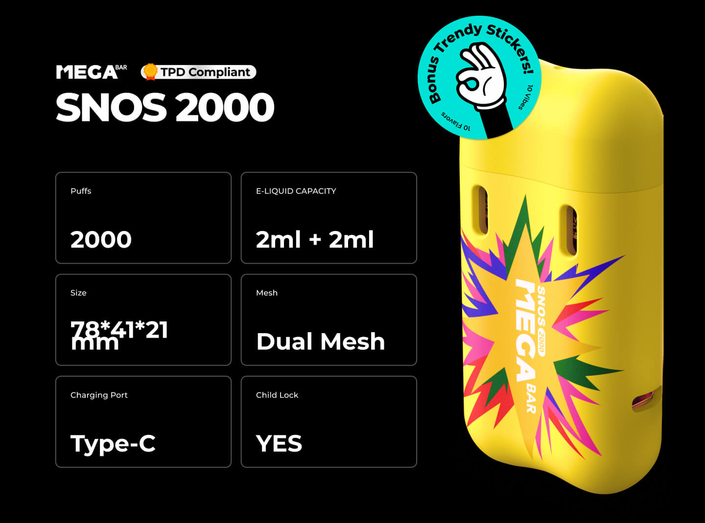 2. More efficient nicotine satisfaction and unexpected big cloud: SNOS 2000 can effectively satisfy your nicotine cravings that you can’t get from continuous traditional vaping. Moreover, you will be surprised by a 2ml cartridge’s big cloud experience.